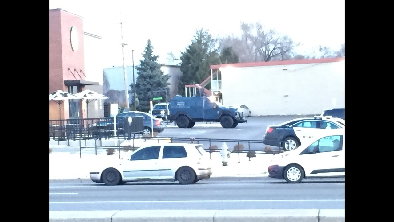 There are at least eight patrol officers on scene. A SWAT team is also there, along with an armored vehicle.